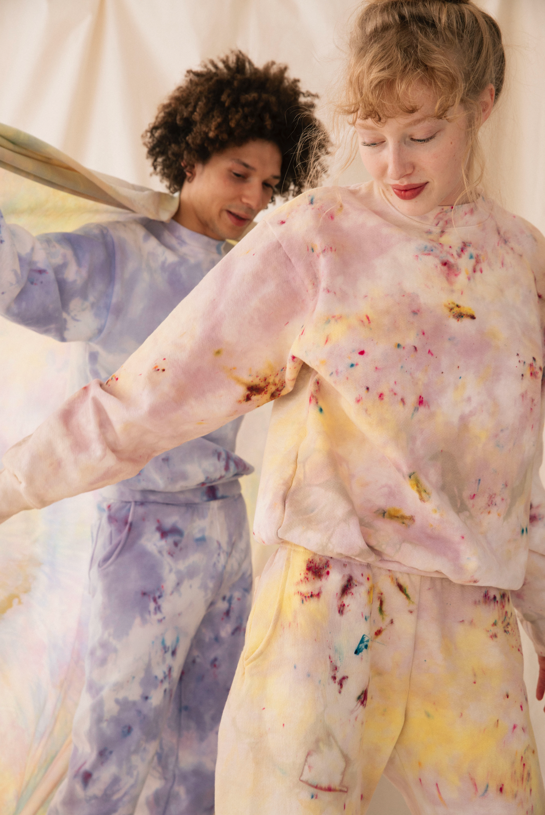 This butter soft sweatshirt in made in the USA and hand dyed in our studio. Made for a loose unisex fit. Dyeing with our nosara technique, a blend of yellows and pinks with some other residual colors.
