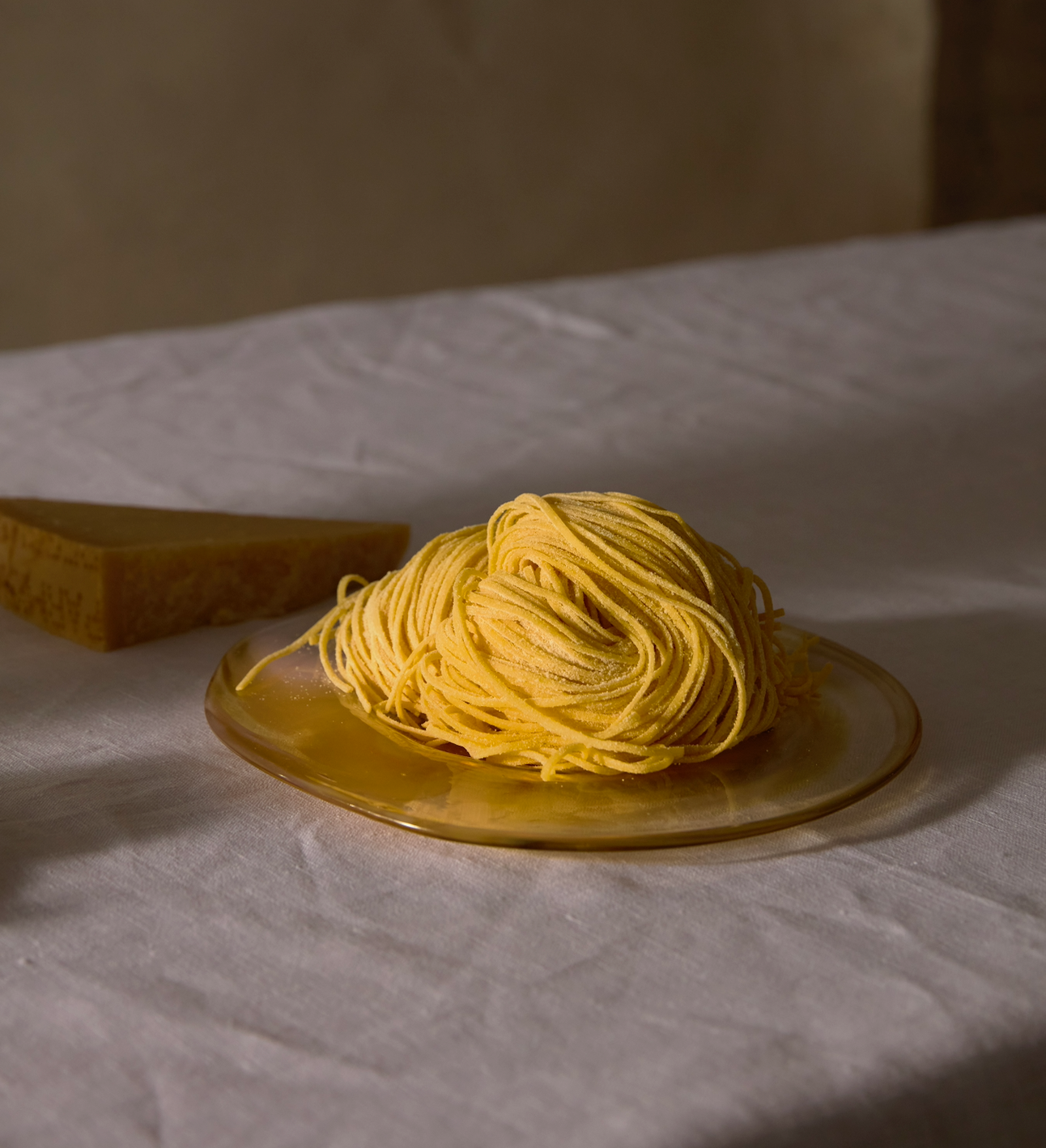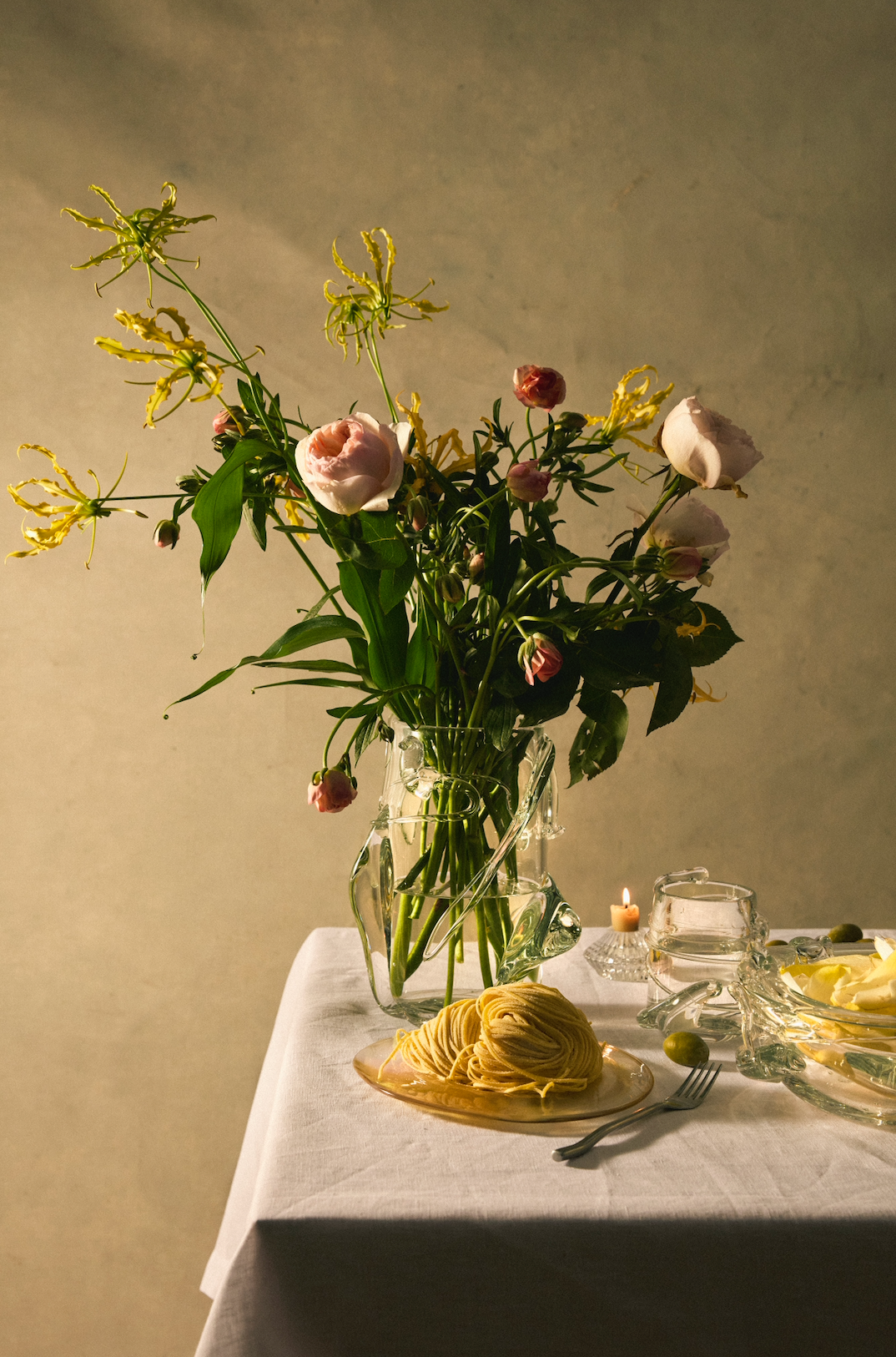 A handblown glass dinner plate with a gentle undulating rim and warm, with warm swirling colors mixed in. Each piece carries tiny variations from the making, so the surface feels alive rather than perfectly uniform. It's table ware the doubles as a one of a kind object. Because it's mouth blown, no two plates are the same and part of the crafts charm.