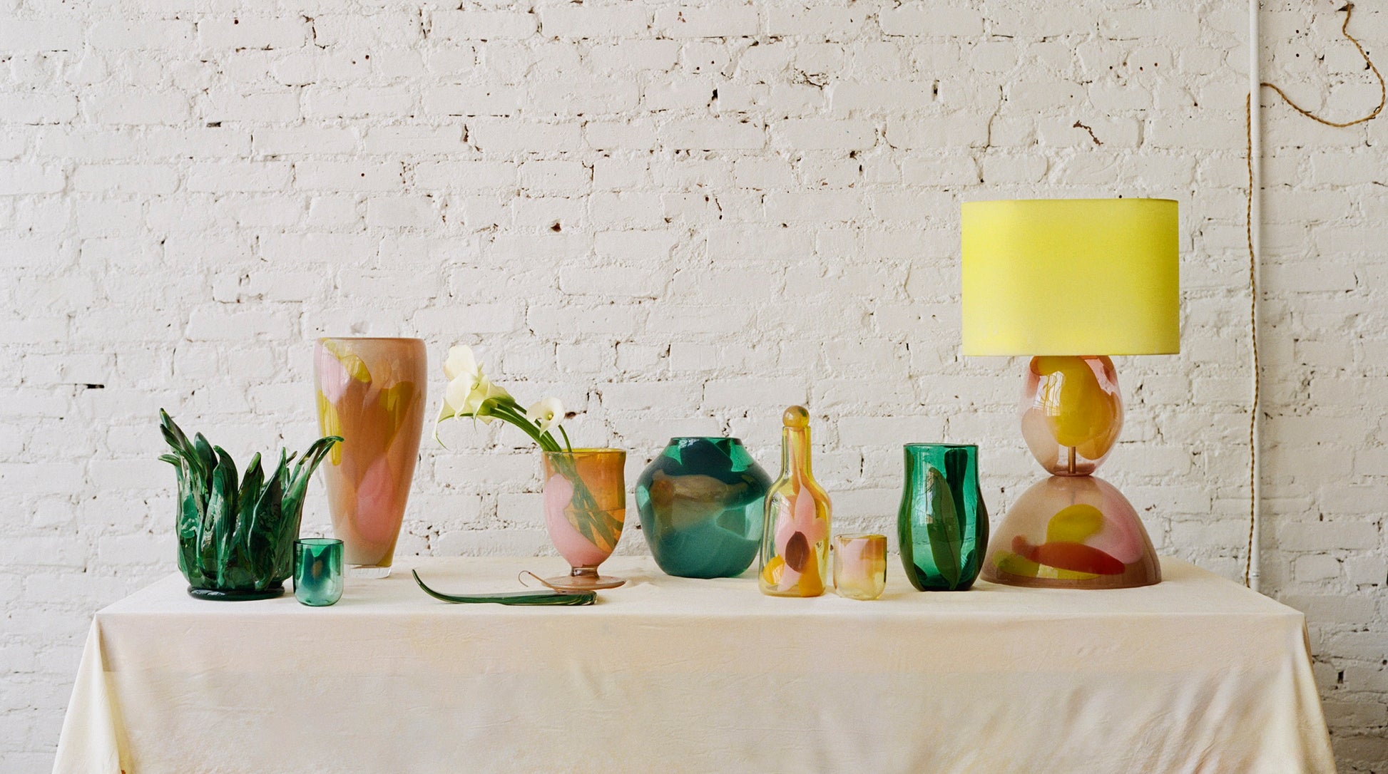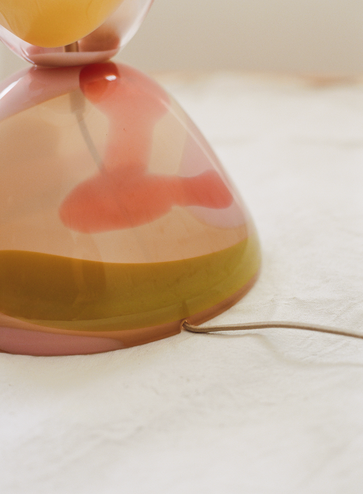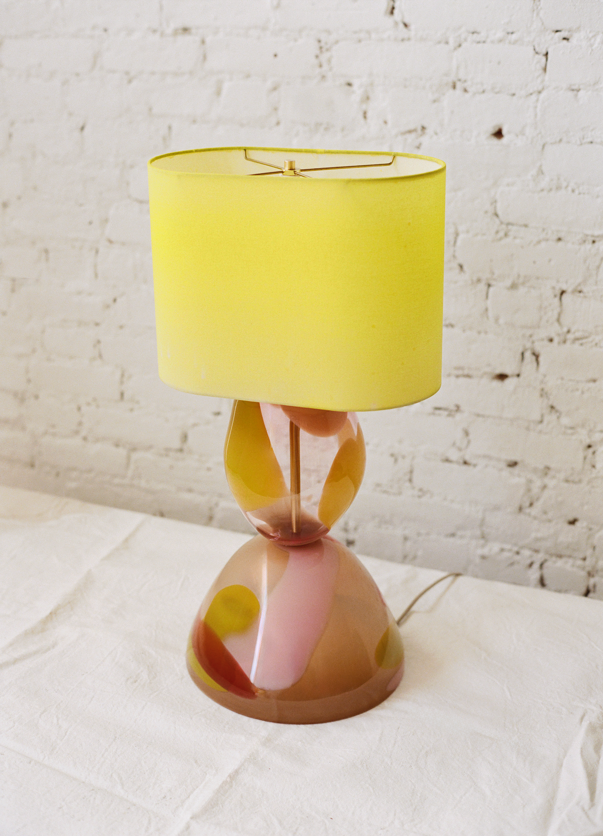 A handblown glass lamp with painterly strokes of glass color and a hand dyed linen lampshade in lemon.