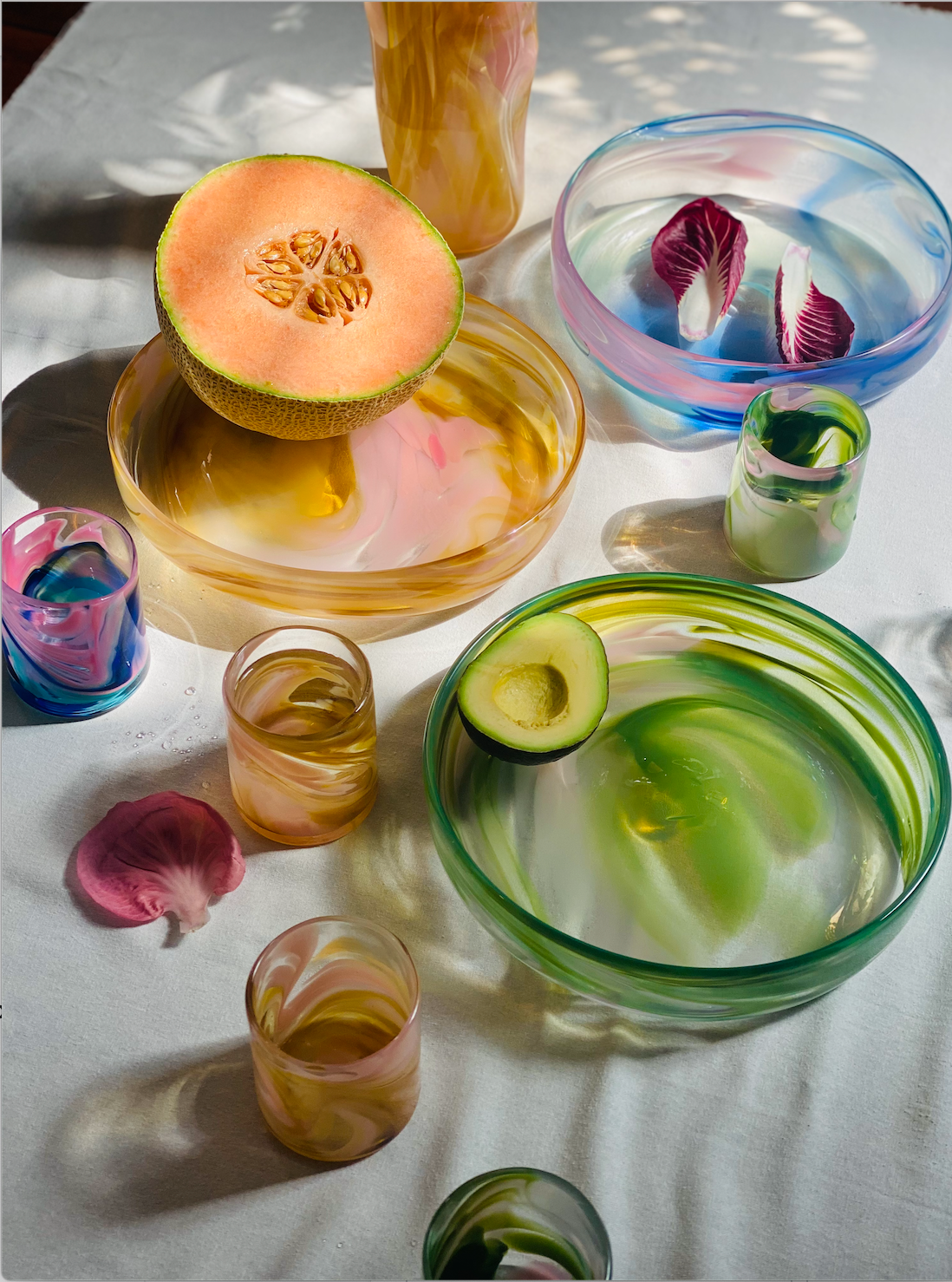 Organically hand blown shallow bowl in watermelon (pinks and greens).